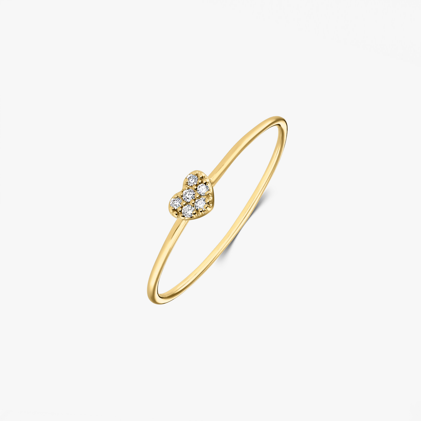 Delikatny pierścionek z żółtego złota 14K, ozdobiony zawieszką w kształcie serca, wysadzaną 6 okrągłymi diamentami (łącznie 0,02 ct). Alma to symboliczna i dyskretna biżuteria, doskonała na uczczenie miłości, przyjaźni lub małych, ważnych chwil