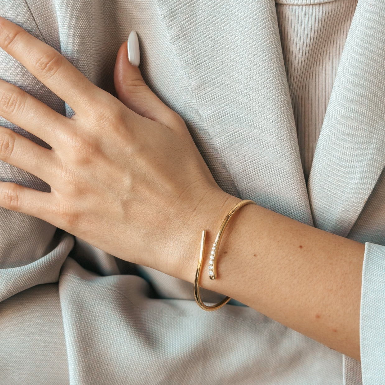 Dodatek, który łączy subtelność z odrobiną blasku – ta otwarta srebrna bransoletka wykonana z srebra 925, pokryta warstwą 14-karatowego złota, ozdobiona jest cyrkoniami dla delikatnego i nowoczesnego efektu. Minimalistyczny i otwarty design idealnie leży na nadgarstku, dodając elegancji każdej stylizacji, nie przytłaczając jej.