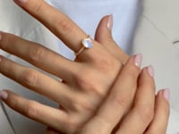 Kamień księżycowy ma wysokość 9 mm i szerokość 7 mm, a obrączka pierścionka pokryta 14-karatowym żółtym złotem jest wysadzana cyrkoniami.
